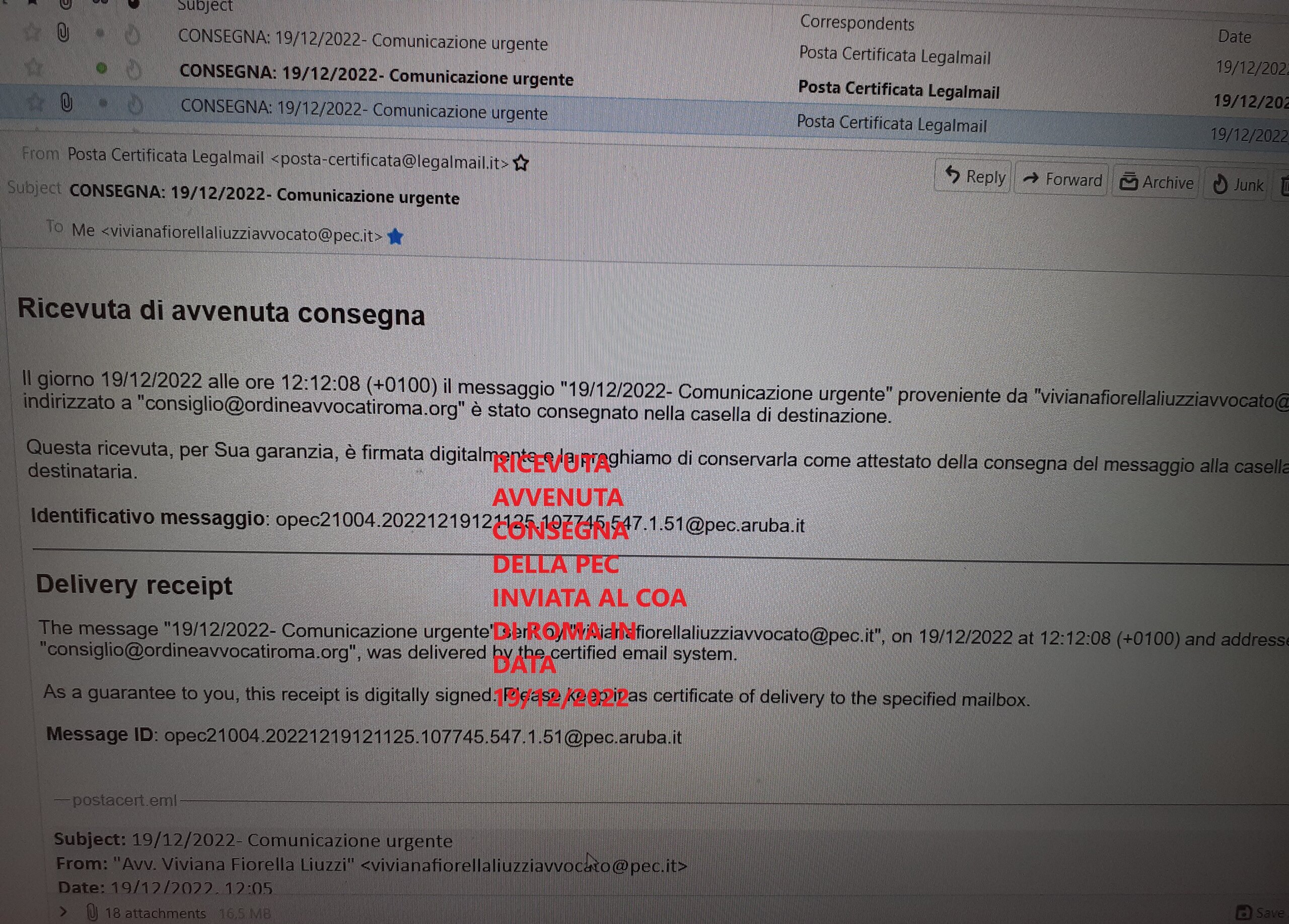 LIUZZI e LIUZZI studio legale e tributario internazionale (Italia- Spagna)- Publicazione a cura dell'Avvocato Cassazionista Viviana Fiorella Liuzzi del 29 dicembre 2022: COMUNICAZIONI INVIATE al CONSIGLIO DELL'ORDINE DEGLI AVVOCATI DI ROMA e ad alcuni Consiglieri tramite PEC e probabilmente mai ricevute dal COA di ROMA e novità in merito.