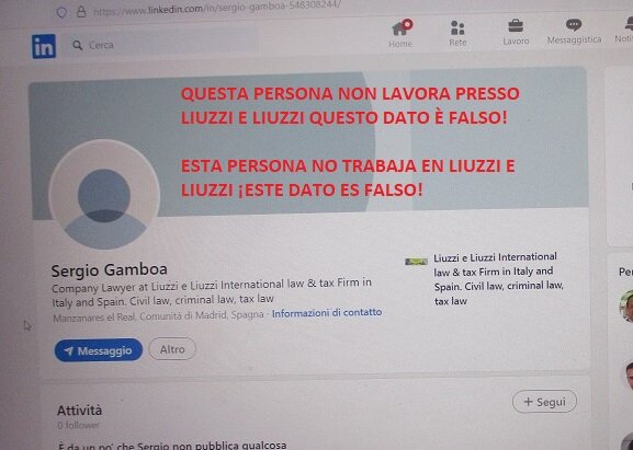 LIUZZI e LIUZZI Bufete interncional de abogados y economistas (Italia- España) - Importante comunicación de la Abogada titular de nuestro Bufete: "Acabo de descubrir que existe en Linkedin el perfil de una persona que se llama “SERGIO GAMBOA” che dice que trabaja en mi Bufete pero todo eso es FALSO. No conozco a esta persona." Presionar sobre "leer" o sobre el título para leer la publicación completa.