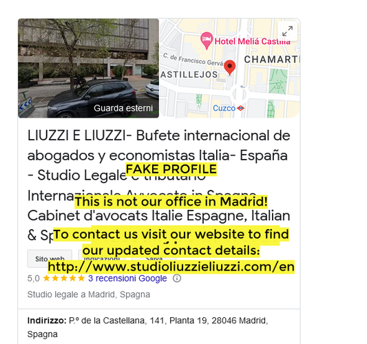 Por favor atención ya que existe en Google un perfil falso que indica que nuestro Bufete se encuentra en la dirección siguiente en Madrid y esto es falso. No tenemos ninguna oficina allí. Por favor para ponerse en contacto con nuestro Bufete es imprescindible visitar nuestra web oficial en la que pueden encontrar nuestros datos de contacto presionar aquí para contactarnos.
