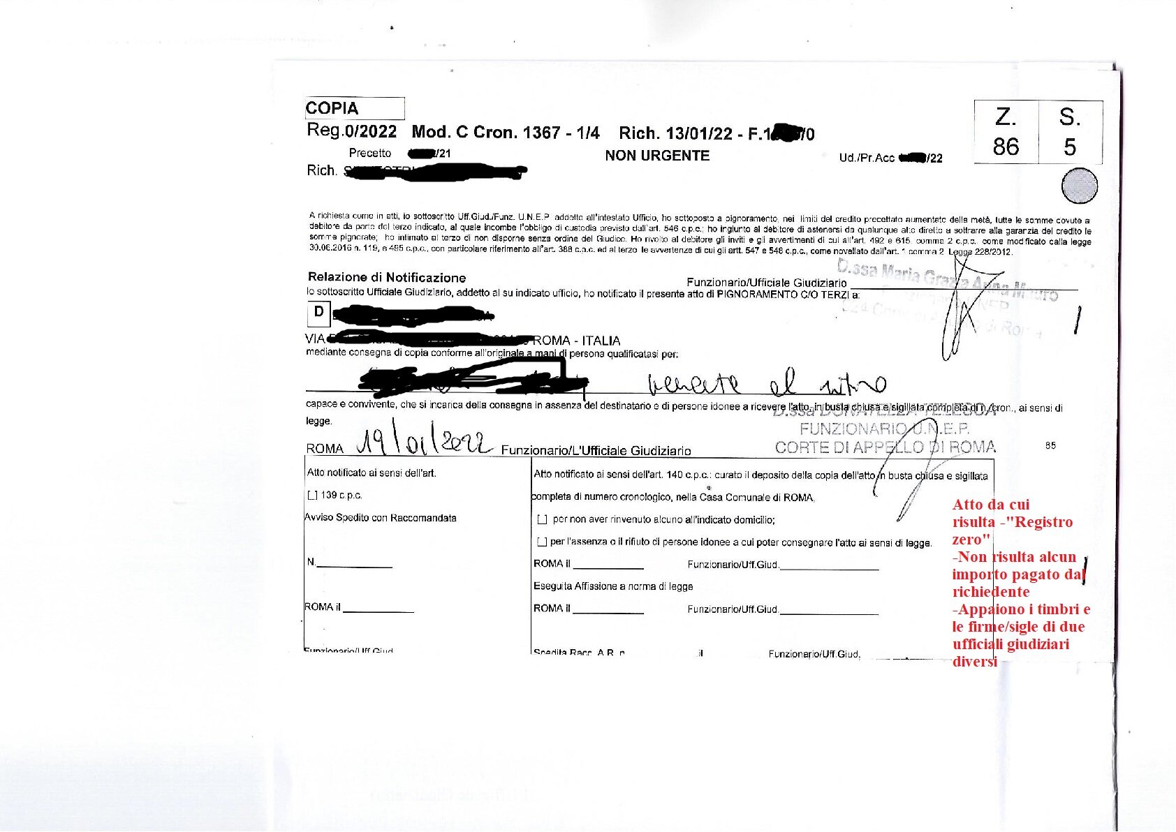 LIUZZI e LIUZZI studio legale e tributario internazionale (Italia- Spagna)- Publicazione a cura dell'Avvocato Cassazionista Viviana Fiorella Liuzzi- Anomali atti notificati in teoria (ma non è certa l'autenticità) dall'UNEP presso la CORTE D'APPELLO DI ROMA. Pignoramento presso terzi in cui non risulta alcun importo pagato dal creditore e registro UNEP “zero”