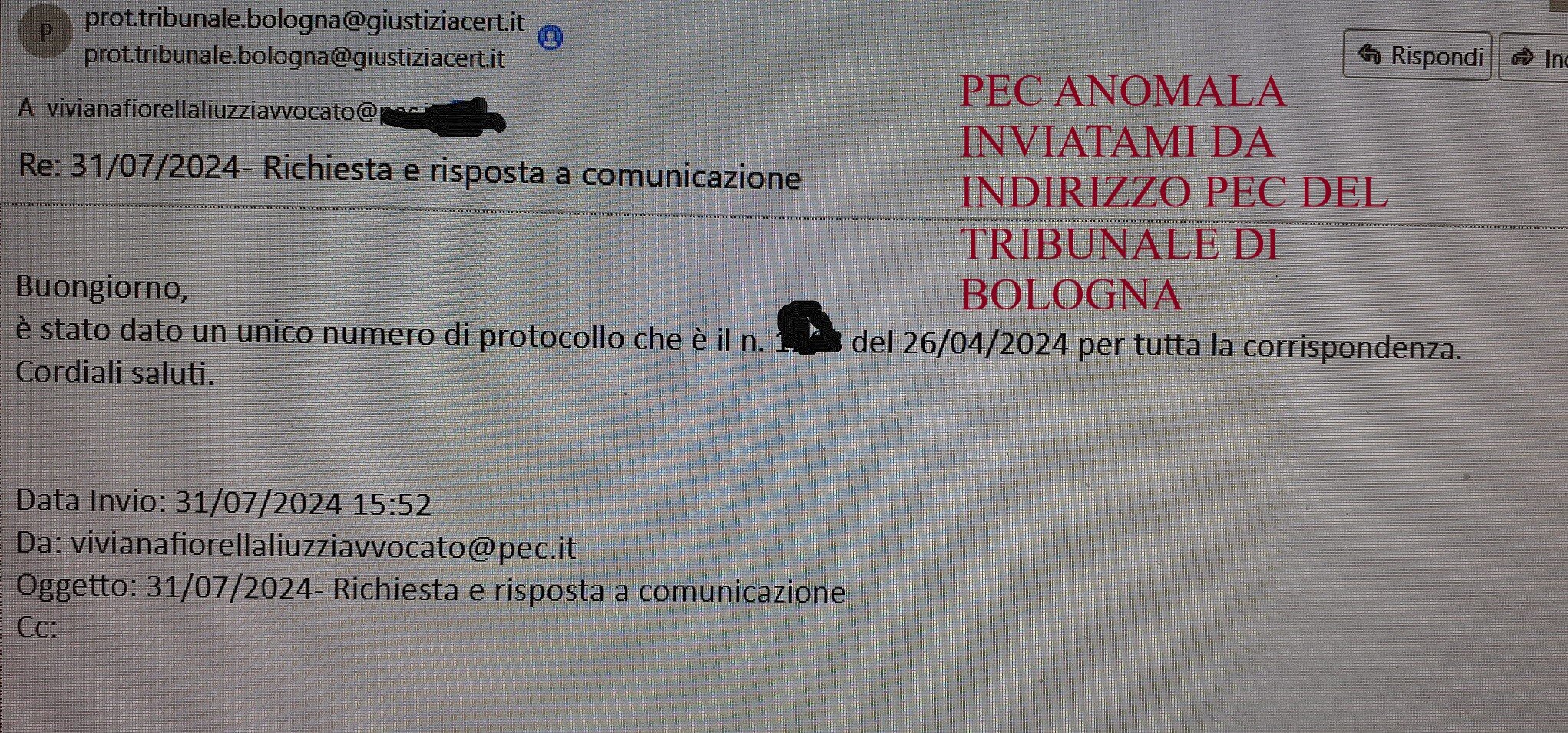 6 settembre- Tribunale di Bologna-Ministero della Giustizia -Anomalie riscontrate nel mese di febbraio e di agosto del 2024- Anomalie causate da terzi ignoti nei fascicoli informatici visibili tramite applicativo Giustizia Civile e gravi anomalie in presunti numeri di protocollo.