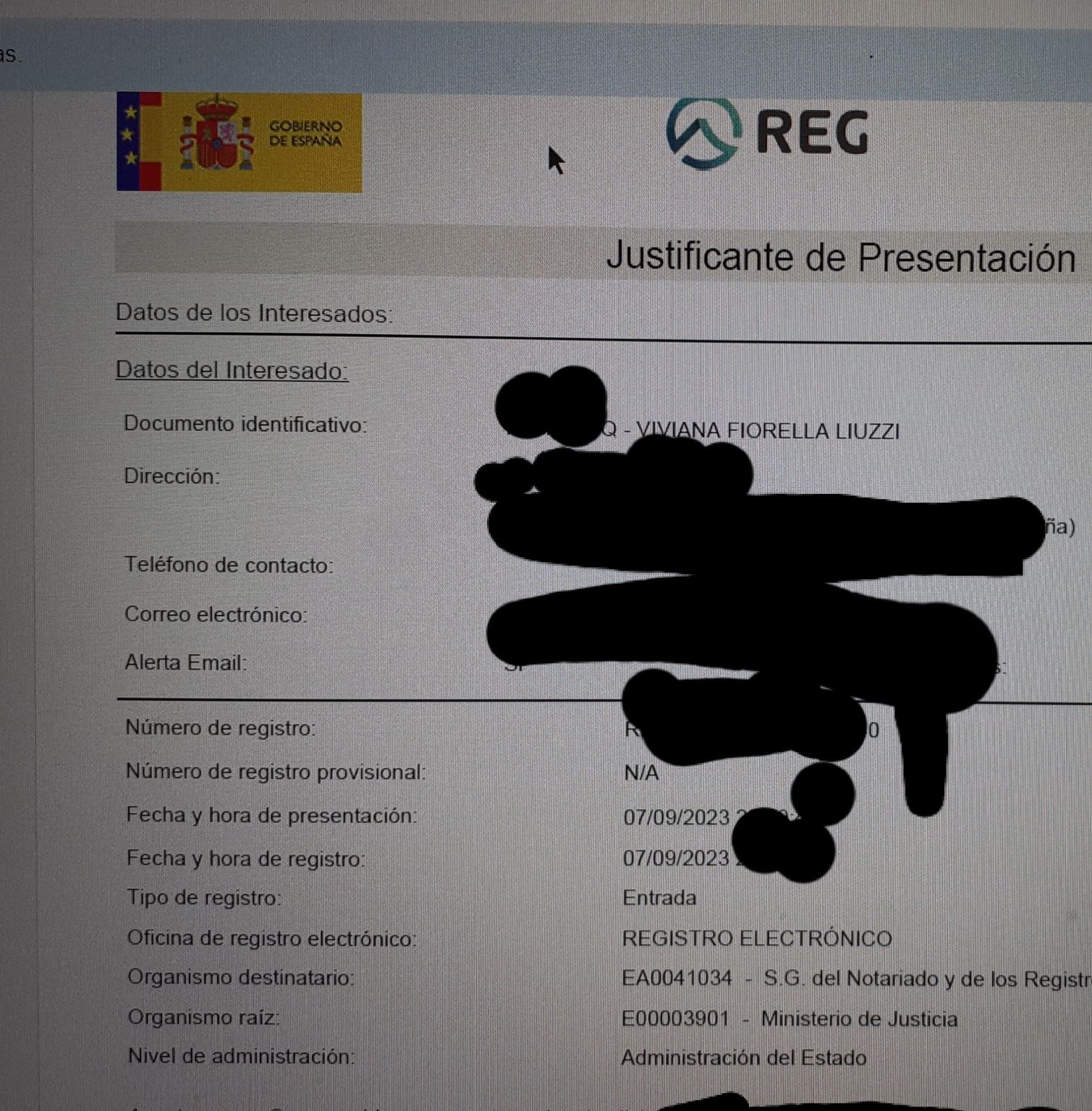 Escrito con los documentos pertinentes ante la correspondiente Subdirección del Ministerio de Justicia de España