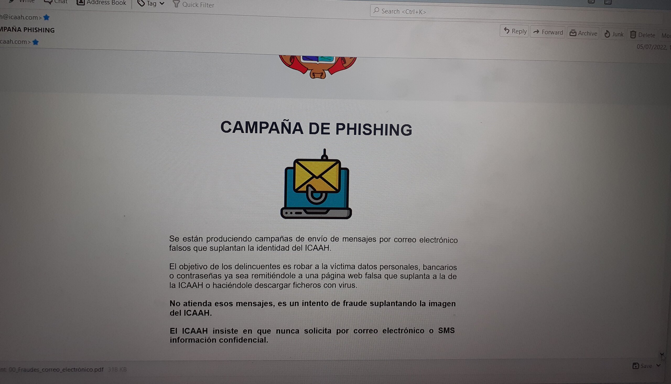 29/08/2022- Comunicaciones enviadas por el Ilustre Colegio de Abogados de Alcalá de Henares que alertan sobre el envío de mensajes por correo electrónico falsos que suplantan la identidad del ICAAH [Presionar sobre la tecla "LEER" o sobre el título para acceder a la publicación.]